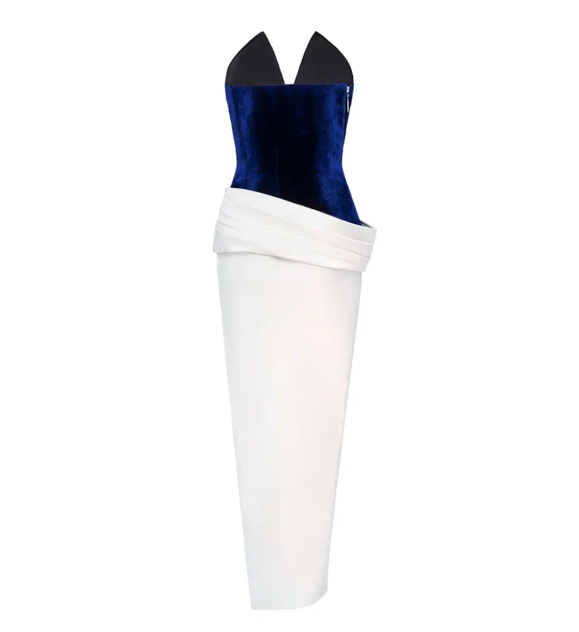 Корсетное платье METEORITE с вырезом капля выполнено из шелкового бархата чернильного цвета и молочного атласа.