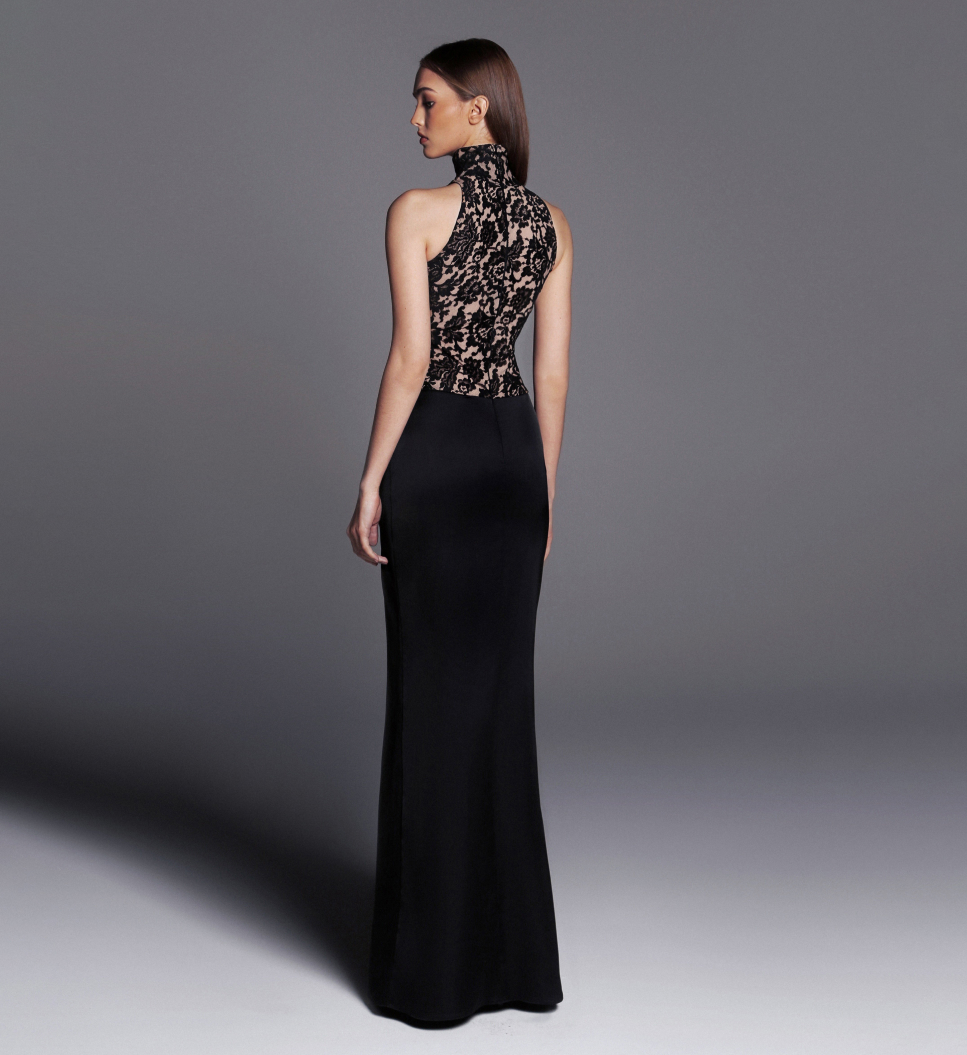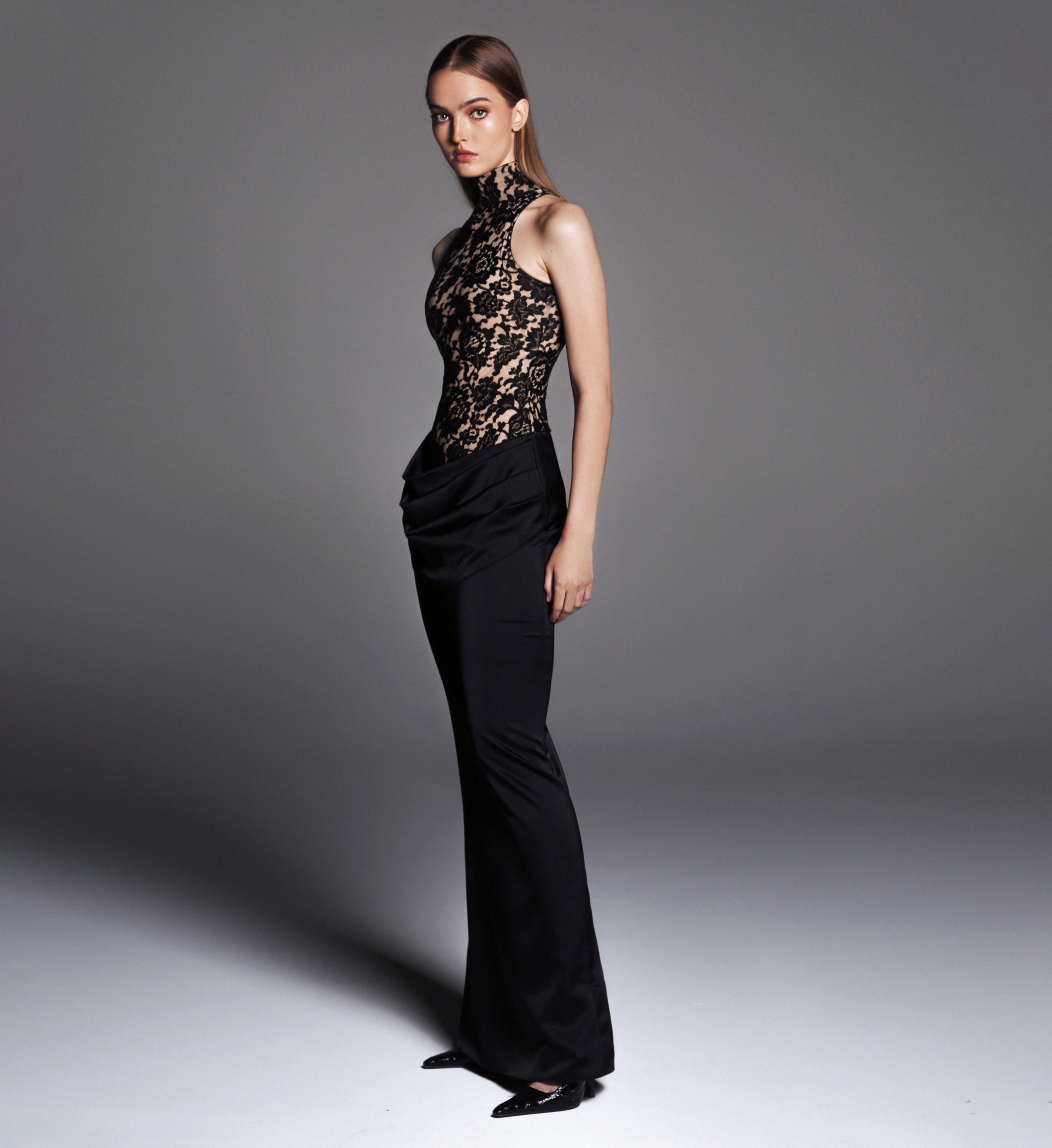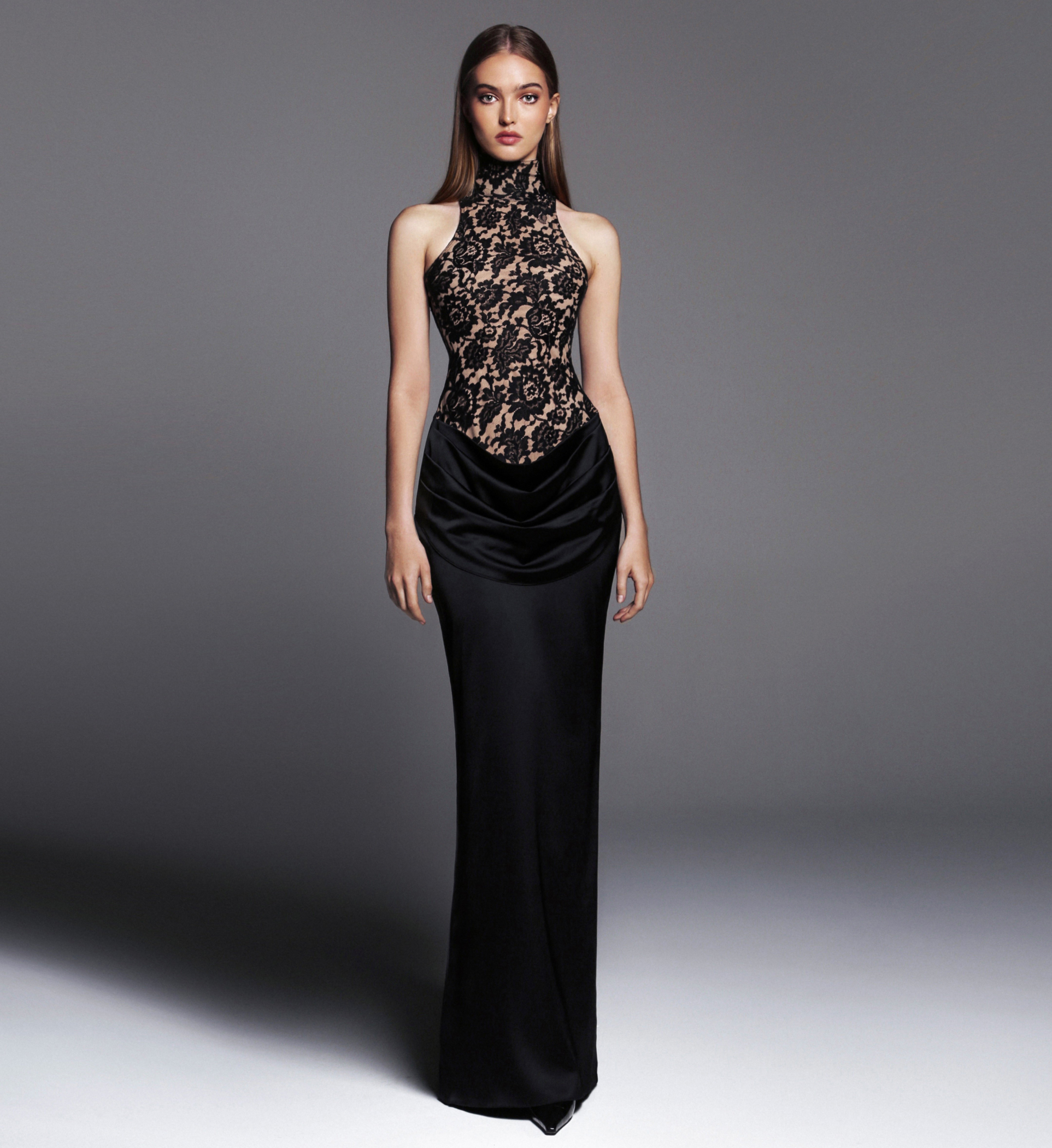 Платье BLACKEST в длине maxi выполнено из хлопкового кружева с драпированной юбкой из черного атласа.