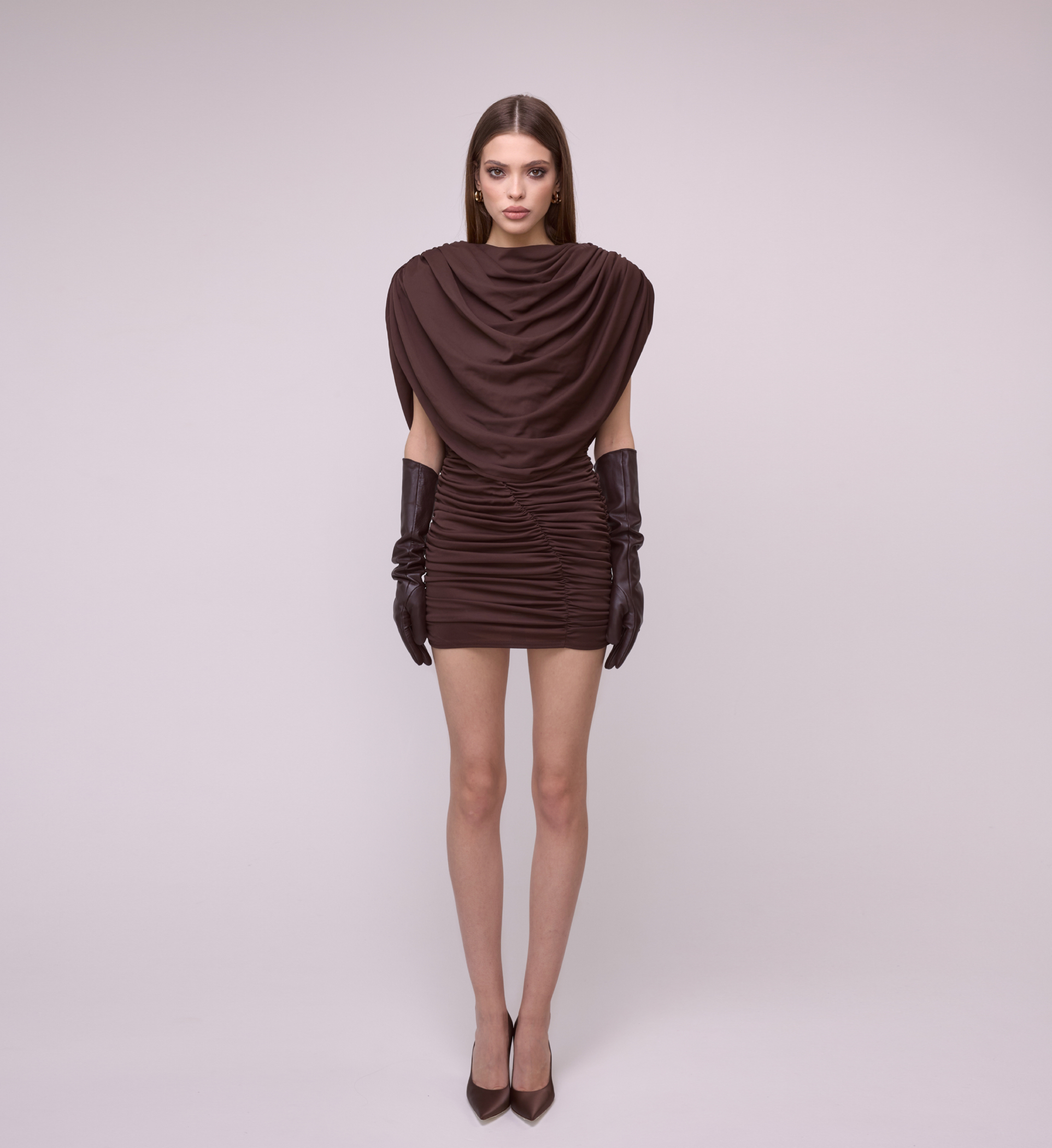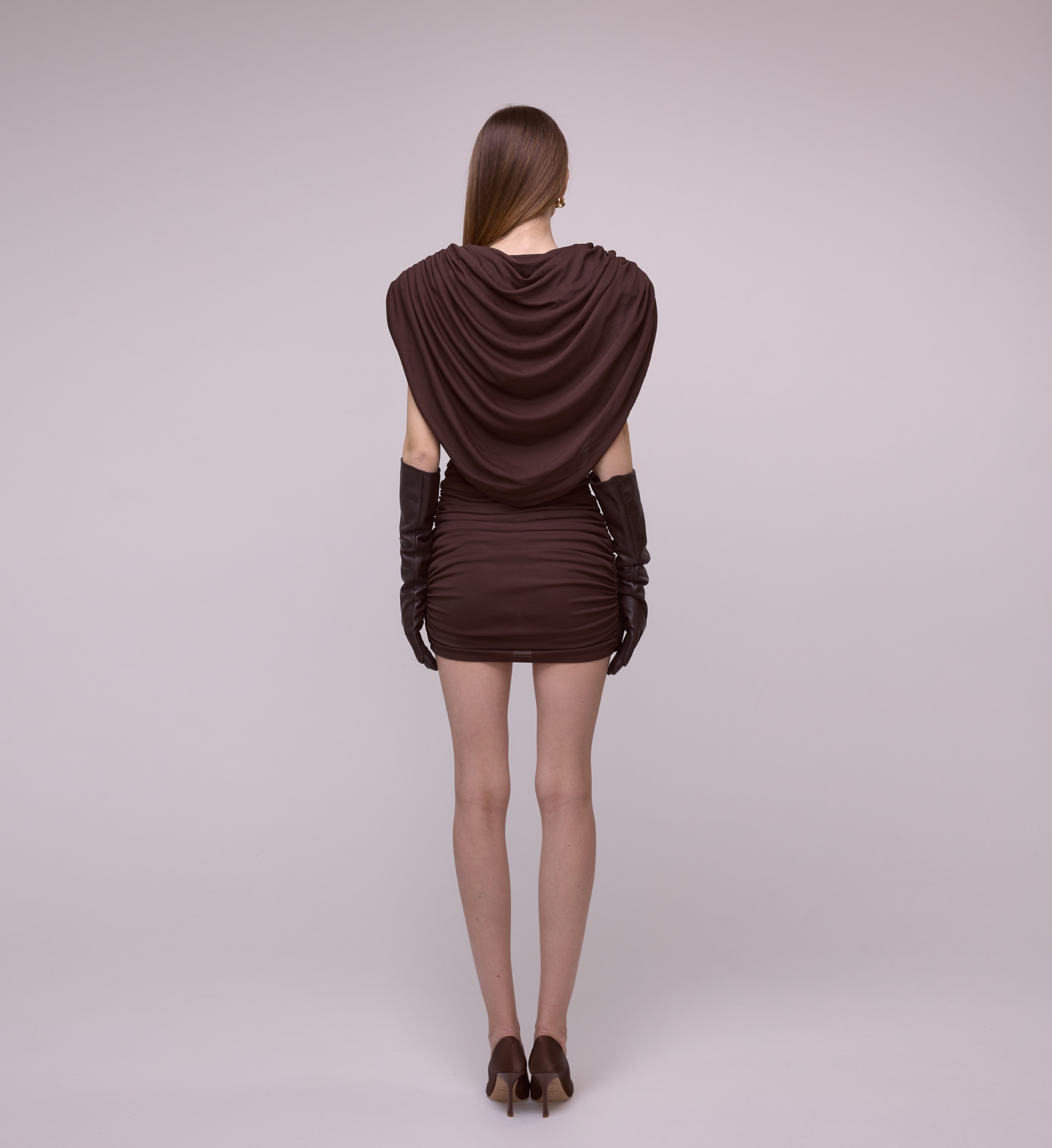 Платье с пелериной и сборками в длине мини из трикотажной вискозы в шоколадном цвете (Перчатки не идут в комплекте).