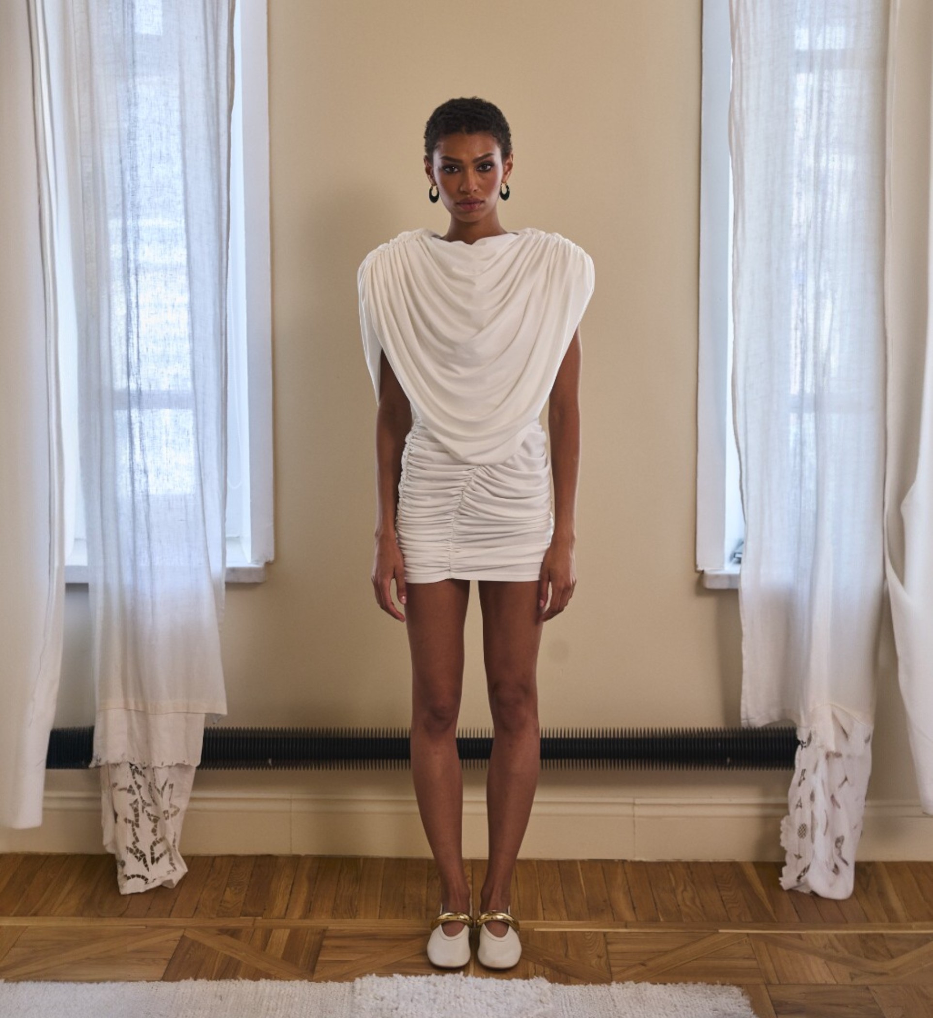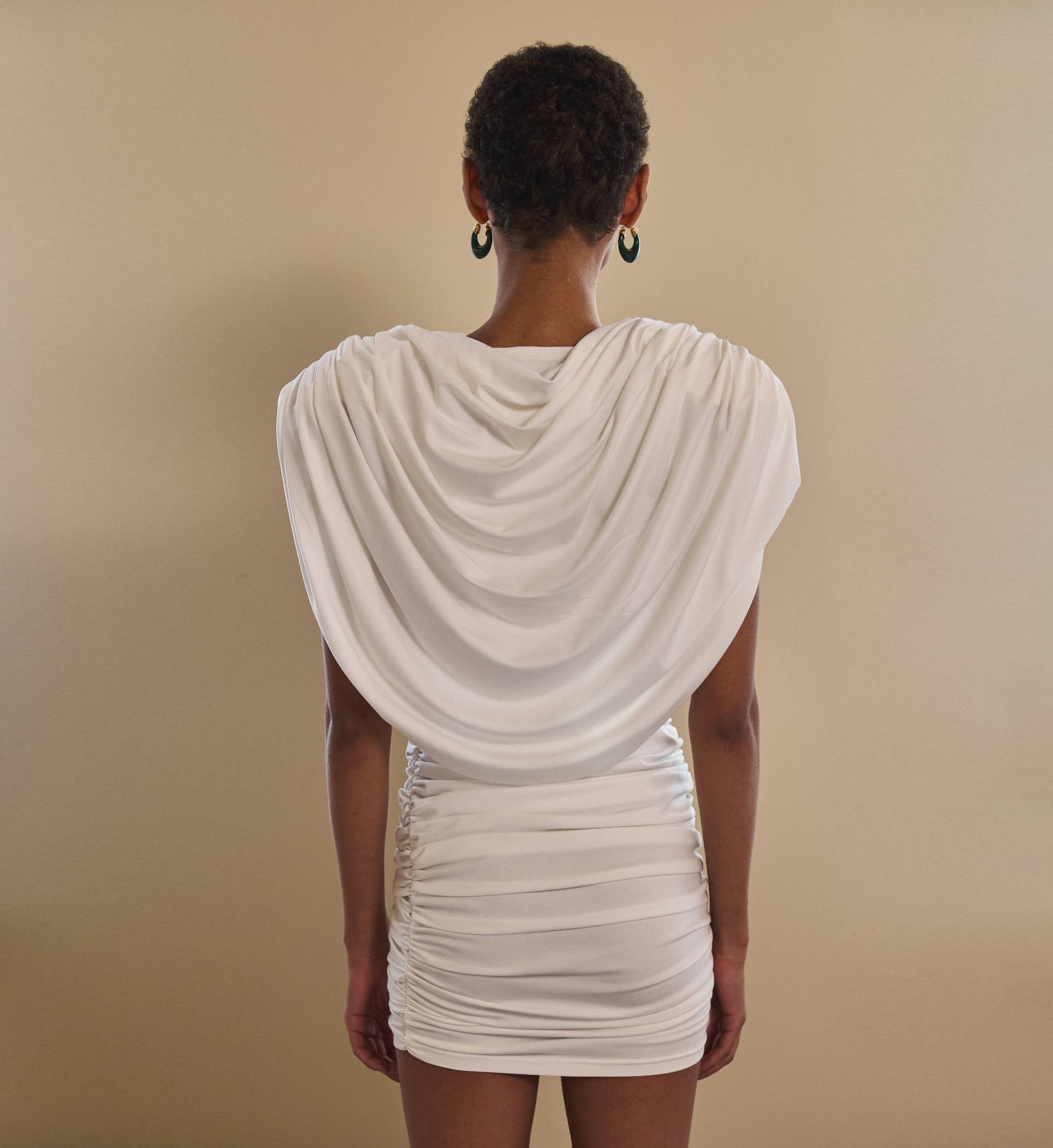 Платье с пелериной и сборками в длине мини из трикотажной вискозы в молочном цвете.