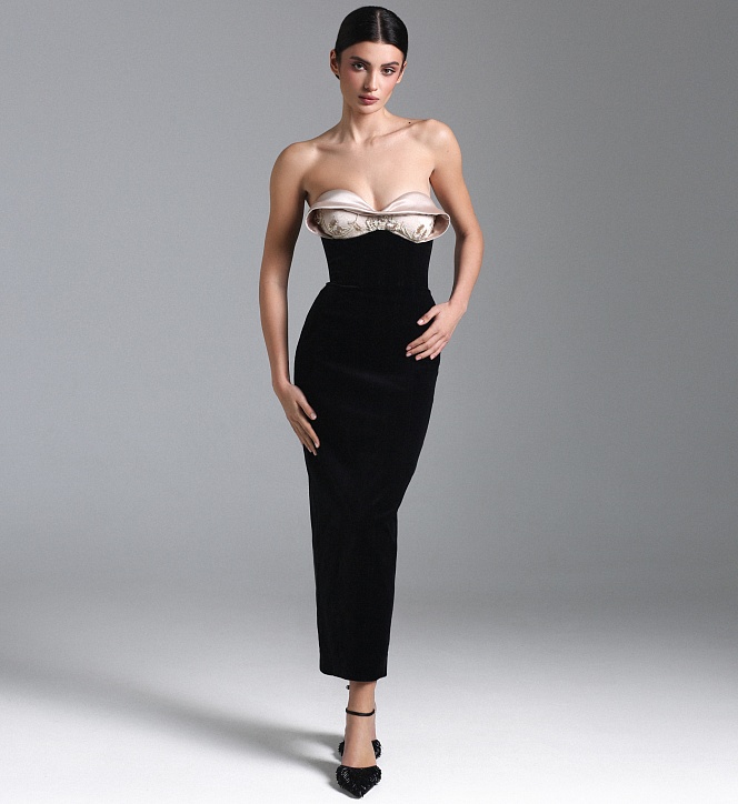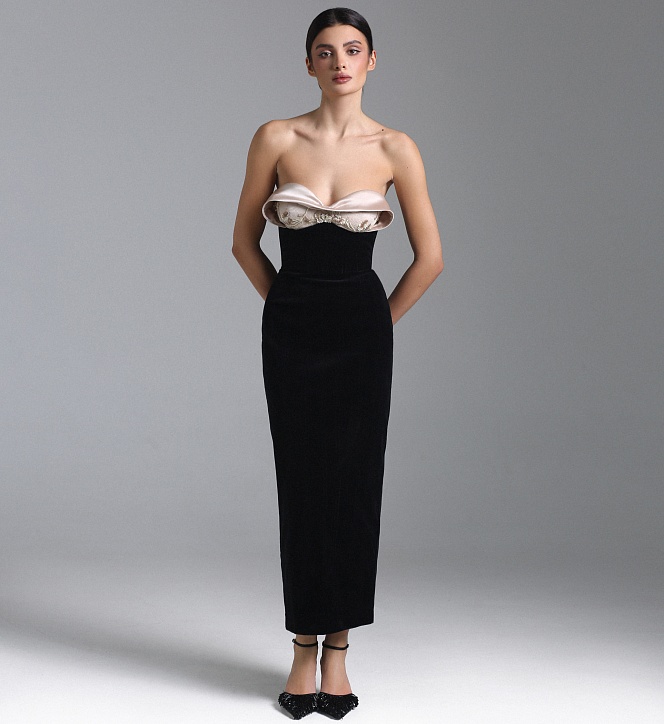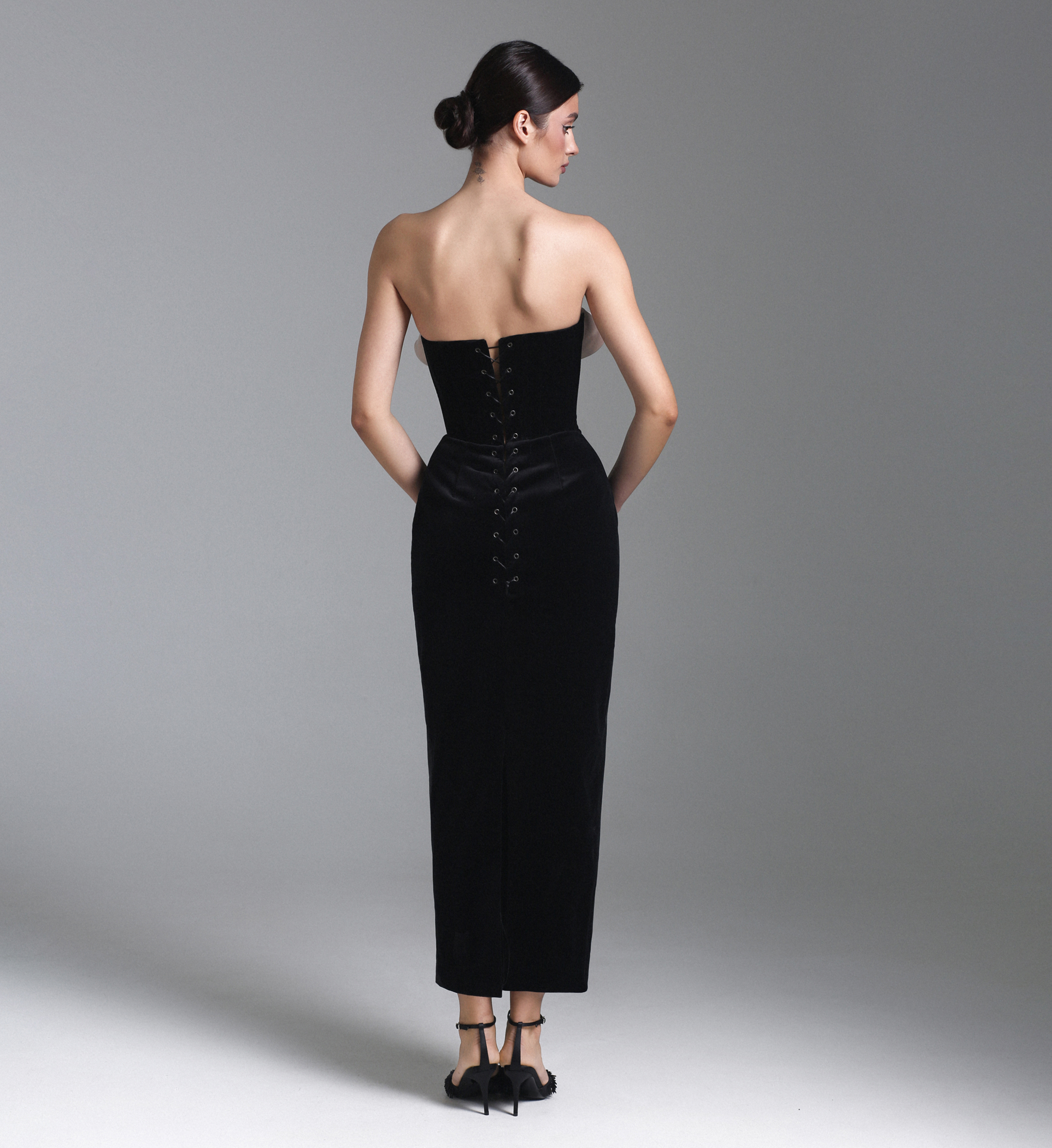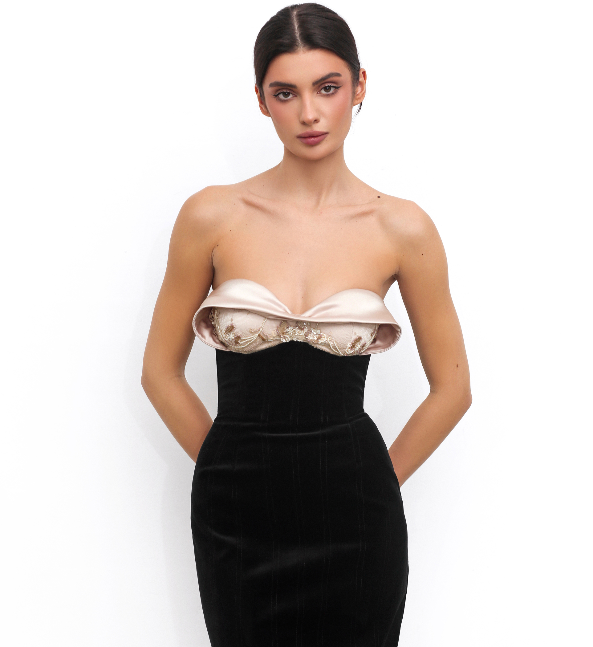 Корсетное платье из черного бархата с отстрочкой с атласным верхом.