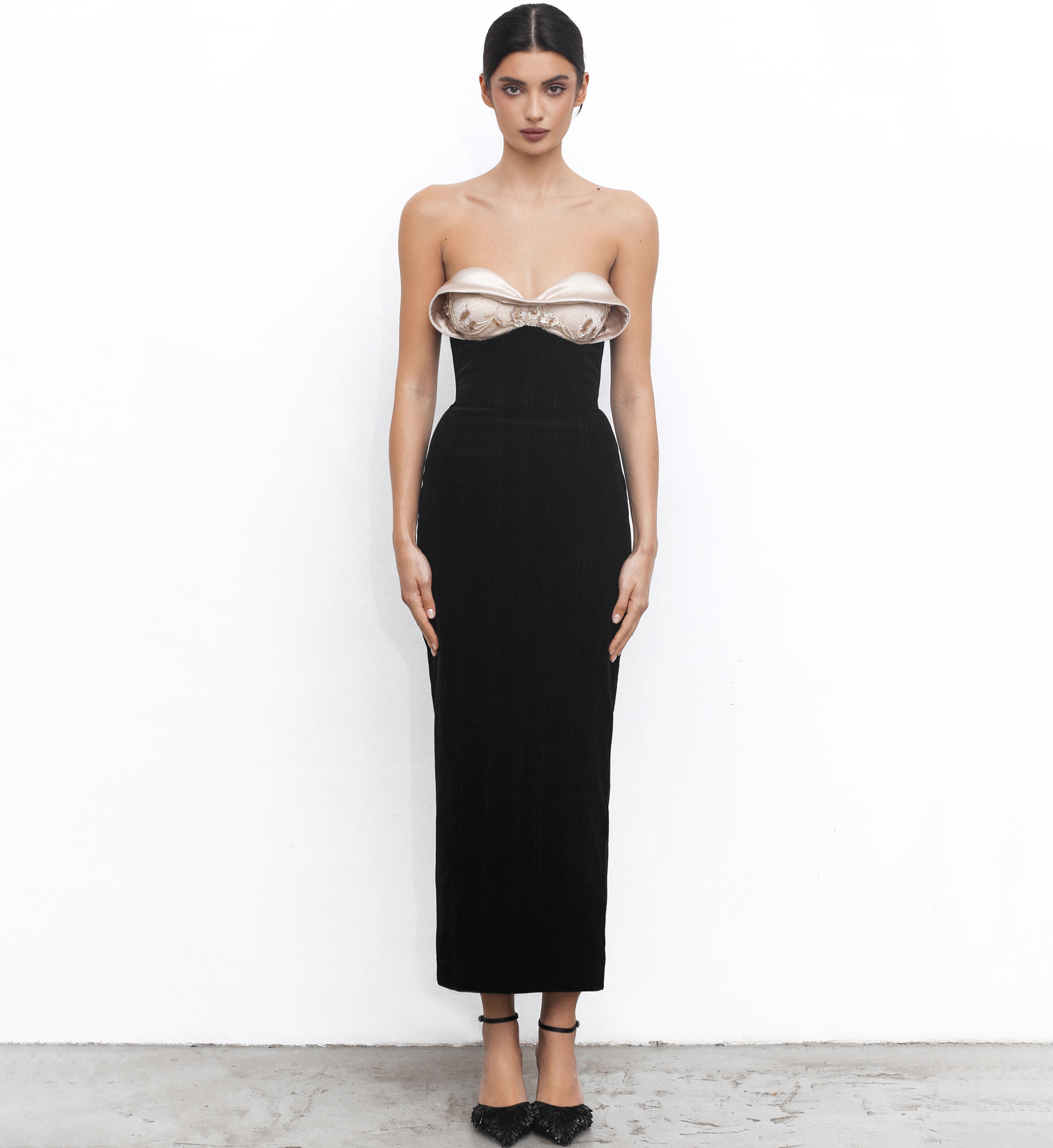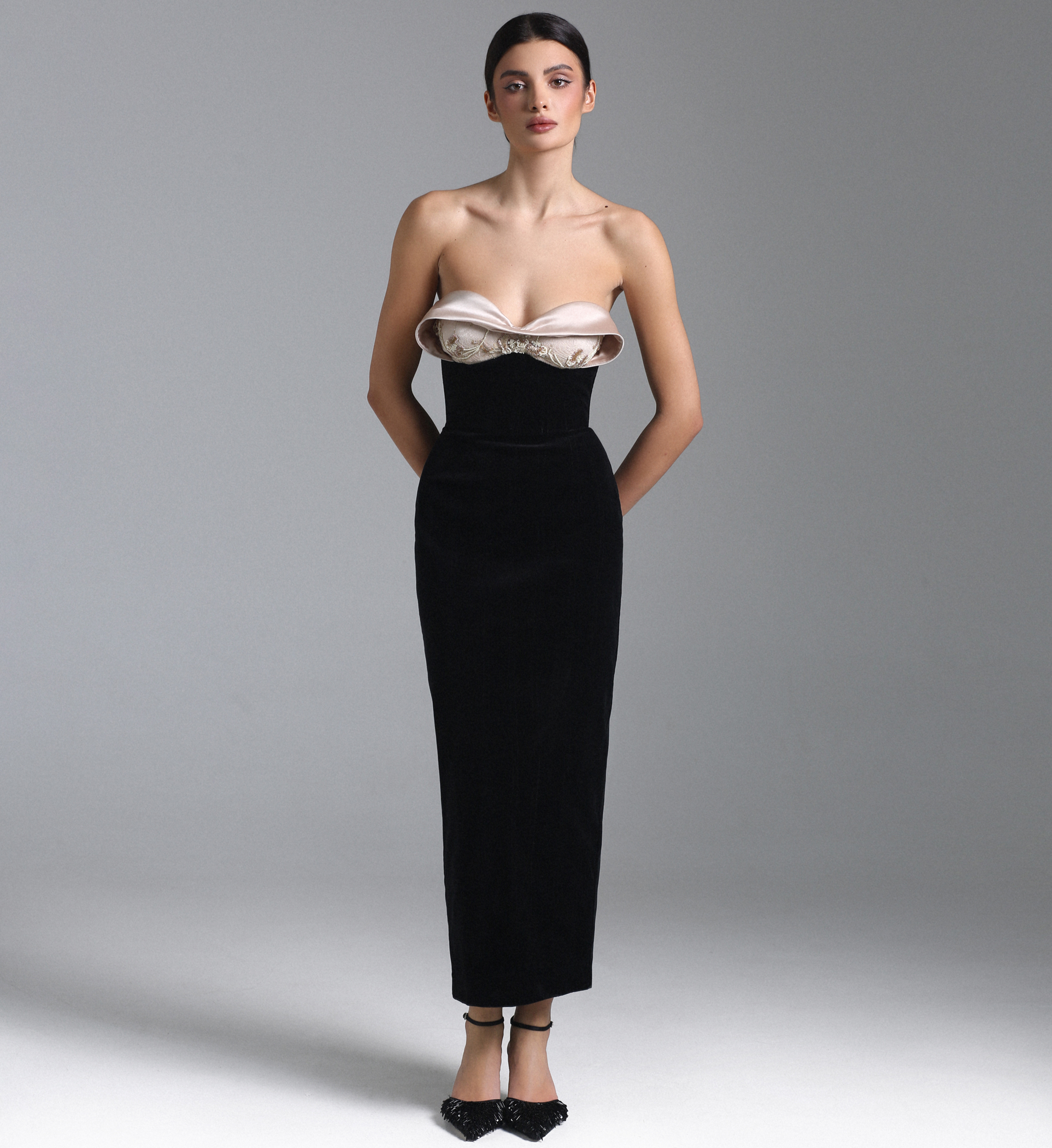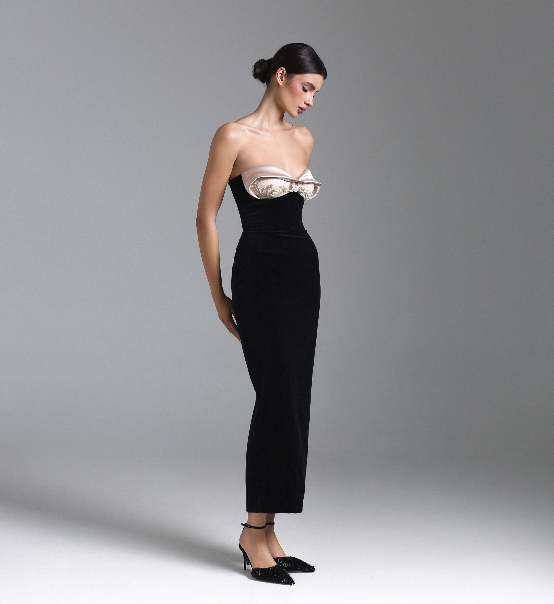 Корсетное платье из черного бархата с отстрочкой с атласным верхом.