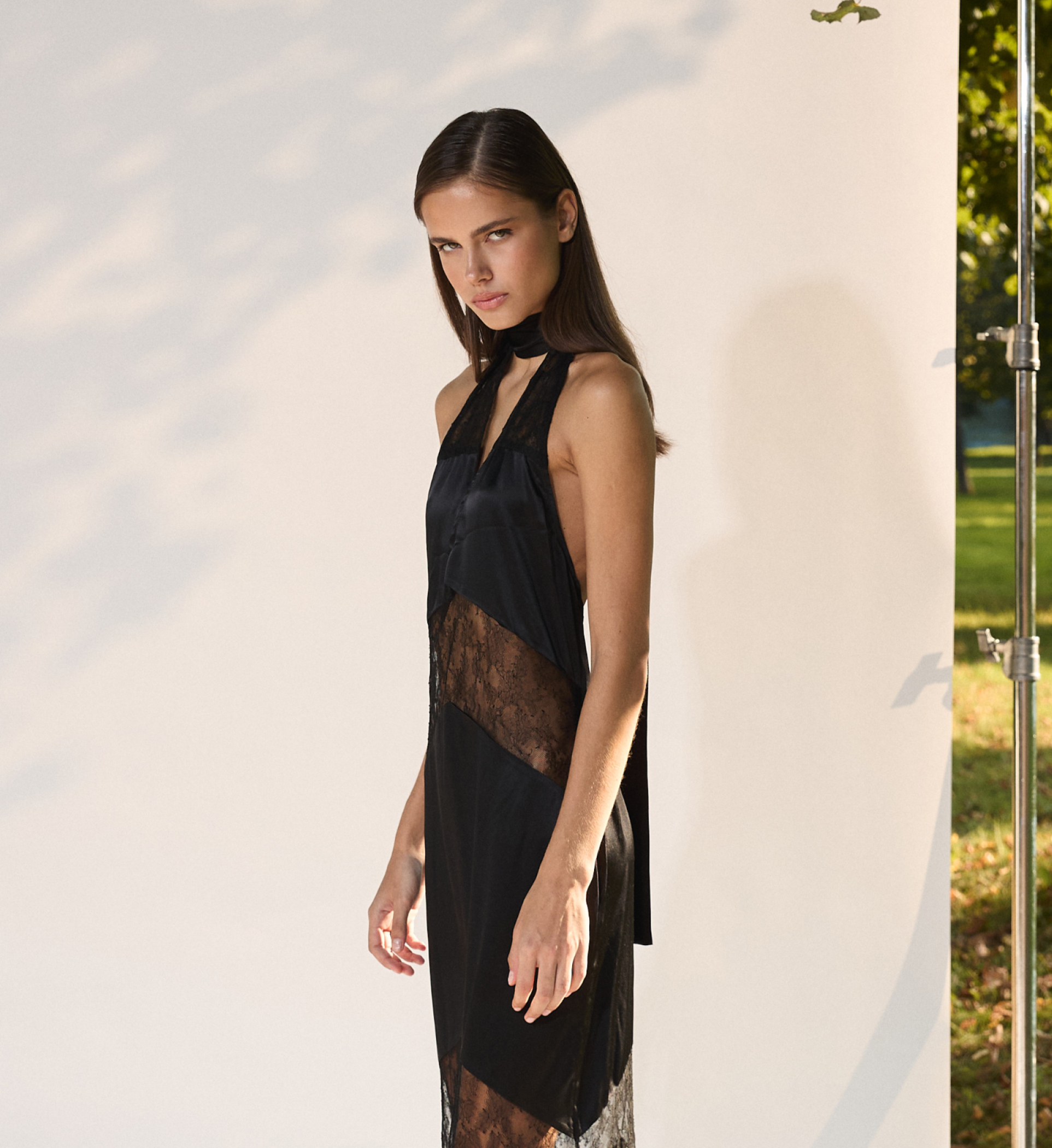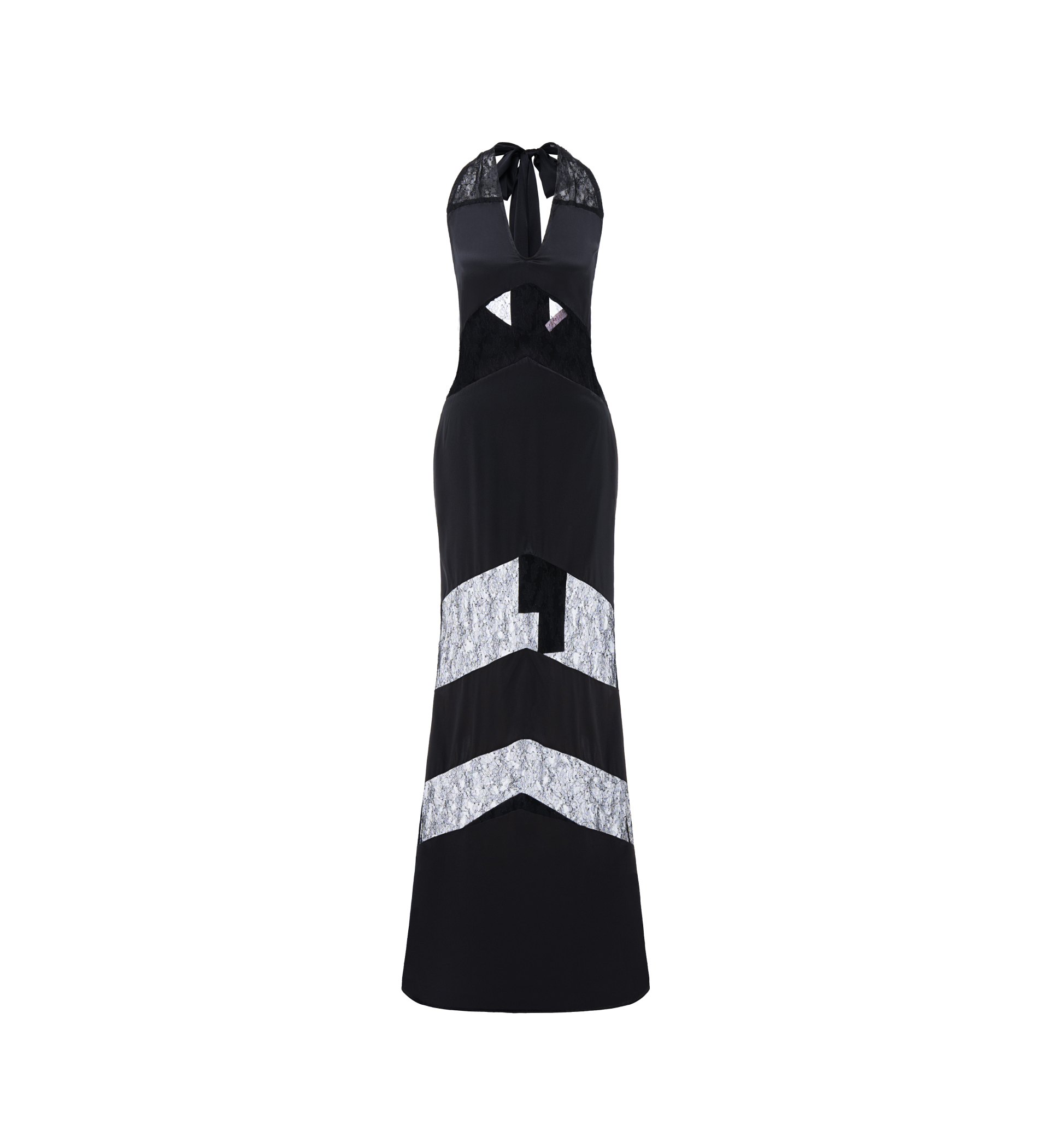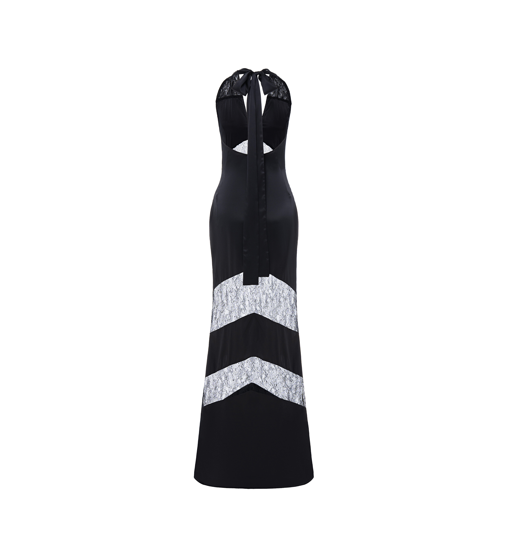 Платье maxi SOLSTISS из натурального шелка в черном цвете для особых случаев притягивает внимание и эффектно струится при каждом шаге. Невесомая ткань, расшитая изящным кружевом + акцентное овальное декольте формируют в движении мягкий силуэт.