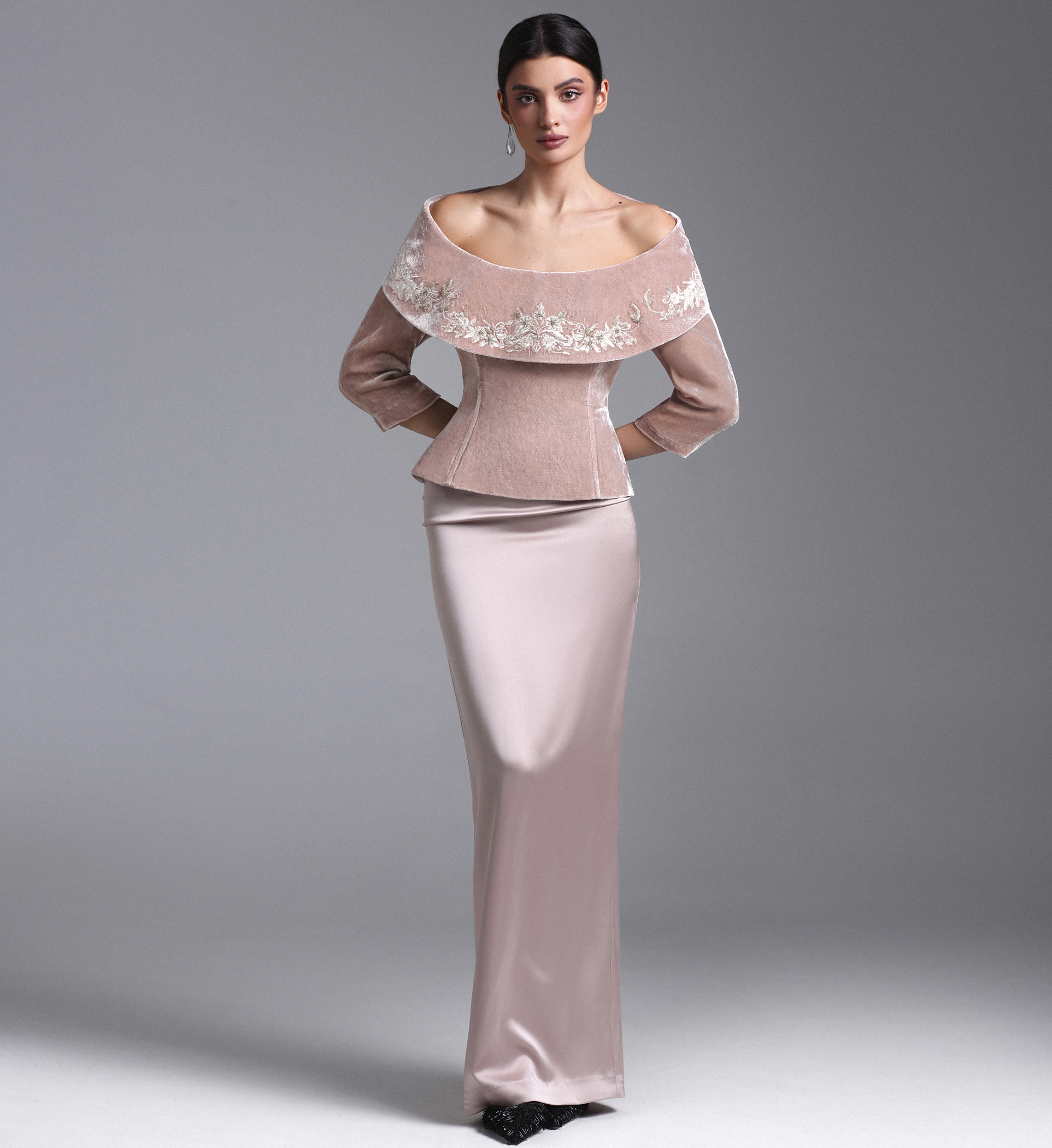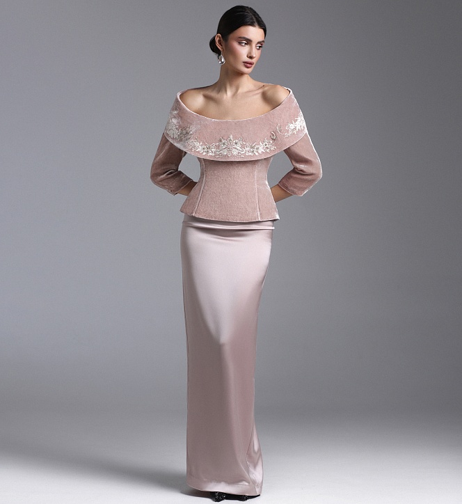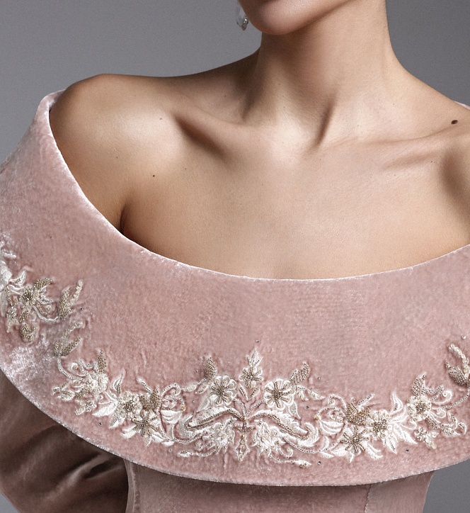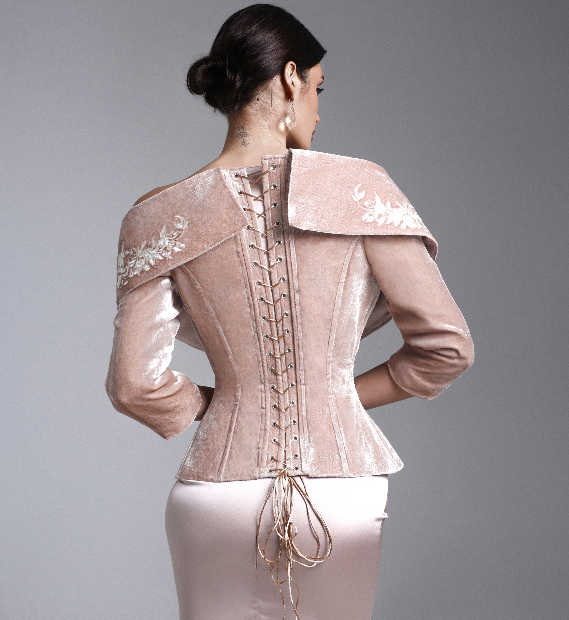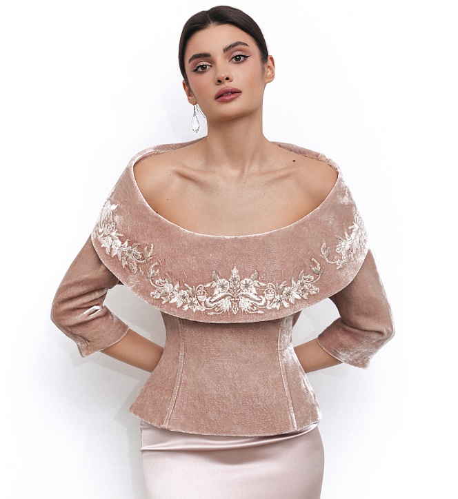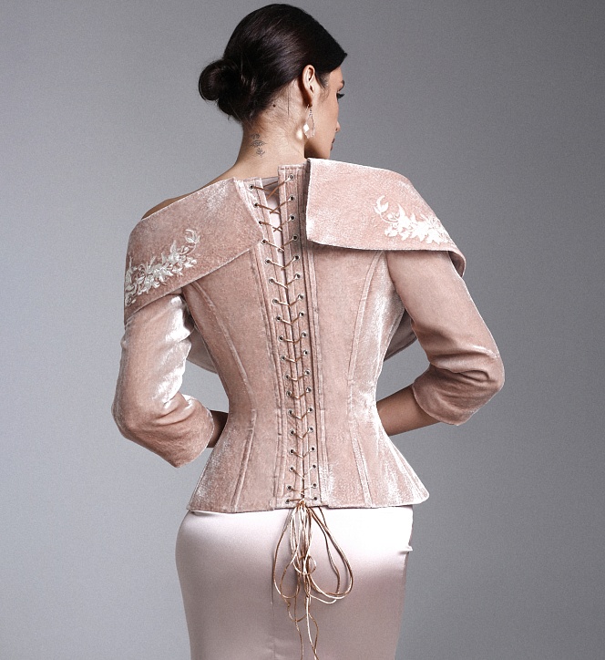 Корсетный жакет с открытыми плечами из бархата с ручной вышивкой стеклярусом и шелковыми нитями.