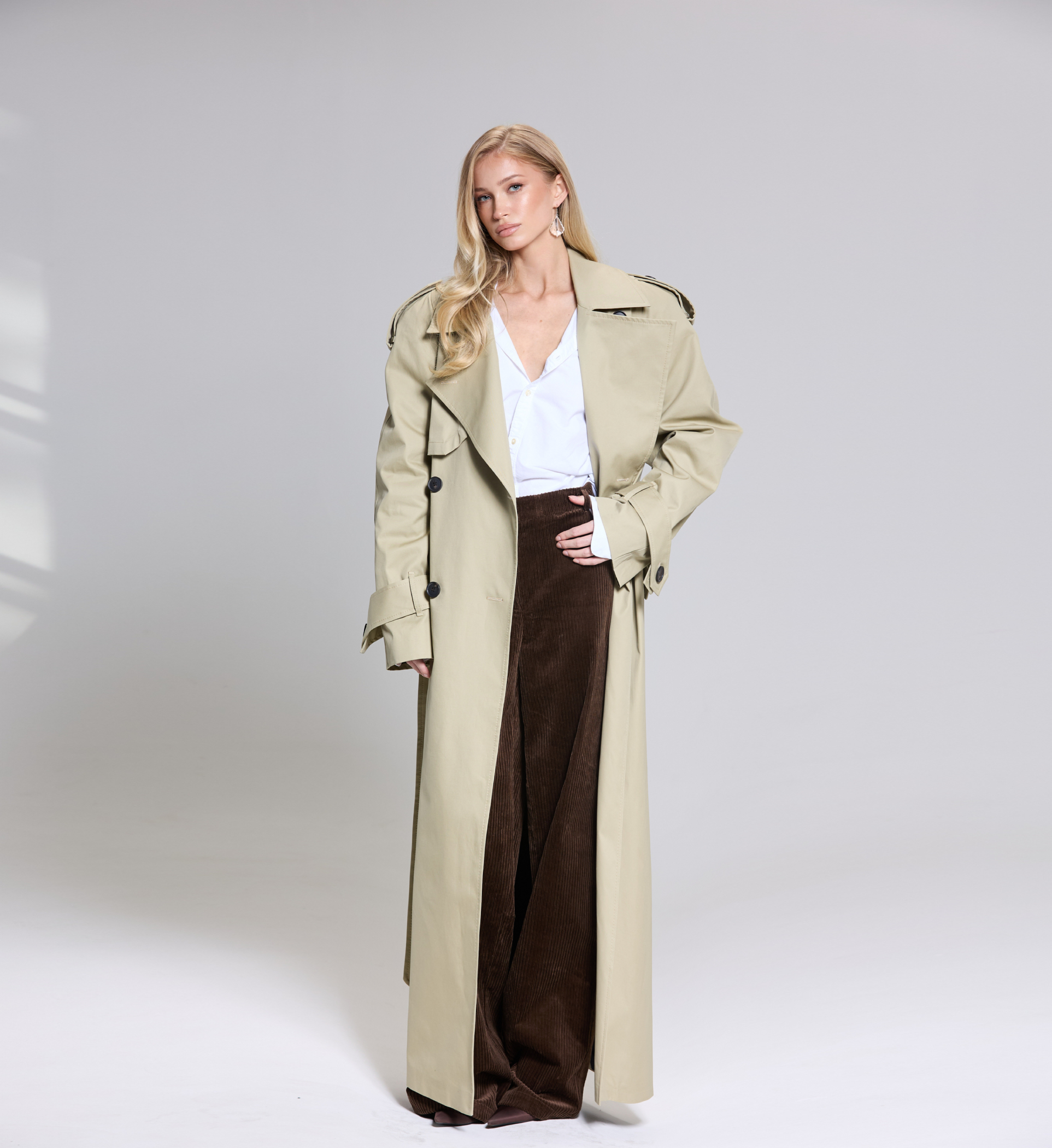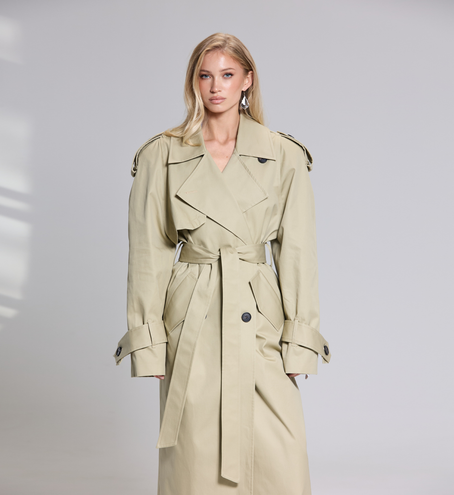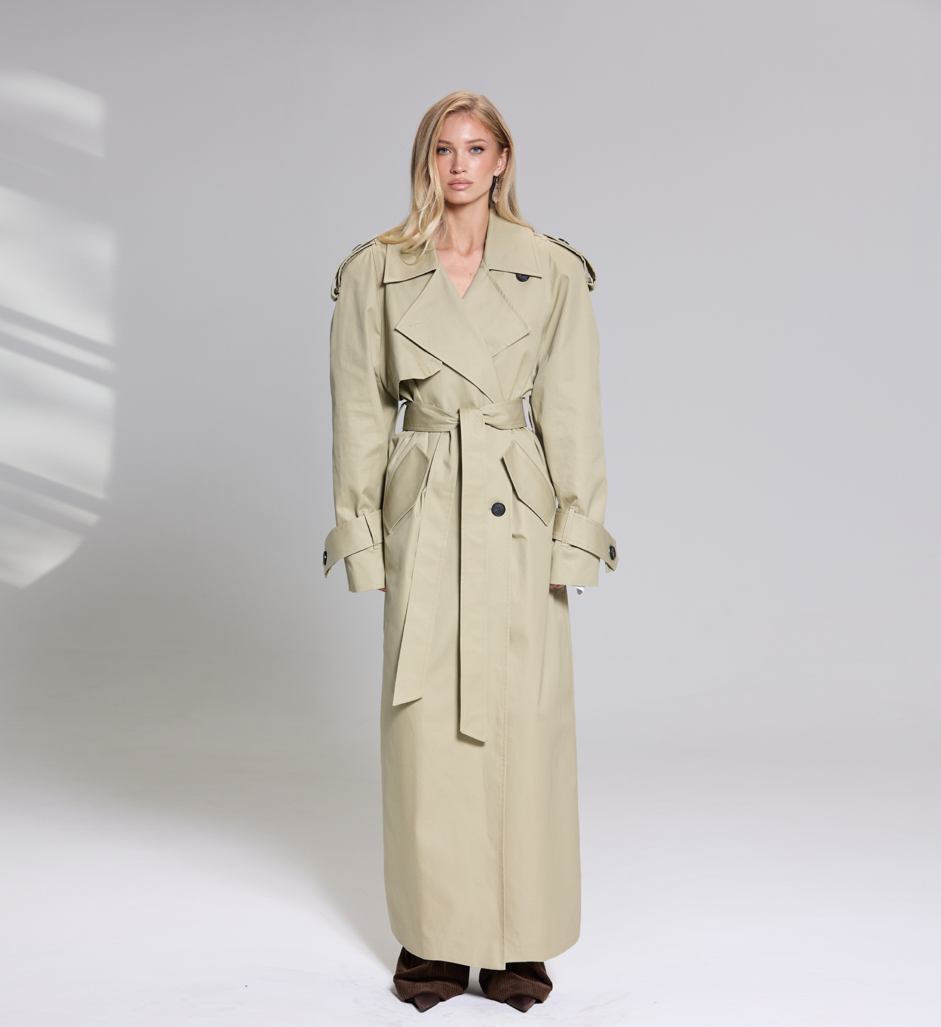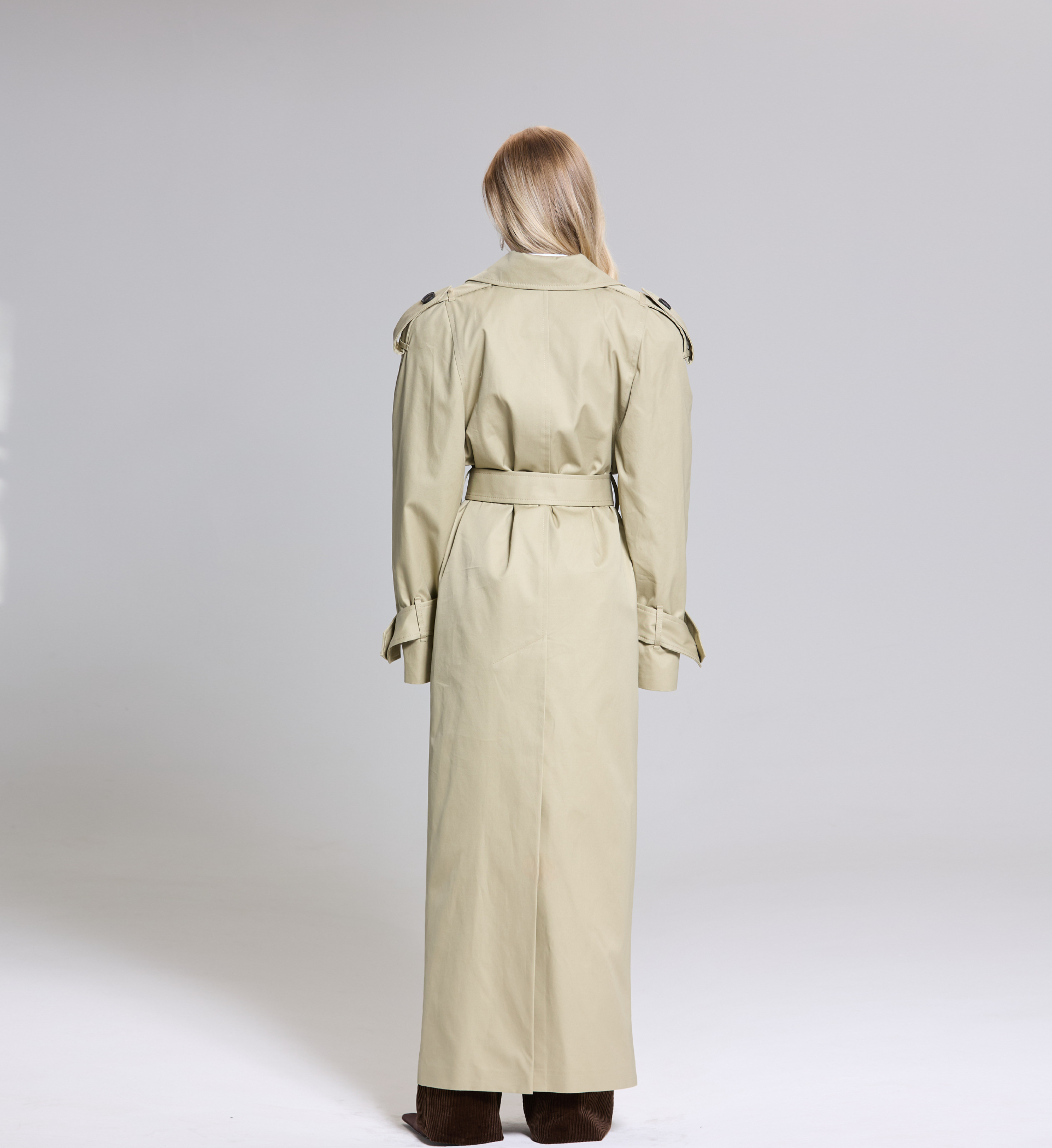 Тренч  T-силуэта из 100%  лоснящегося хлопка с водоотталкивающей пропиткой в длине maxi с пуговицами из рога.