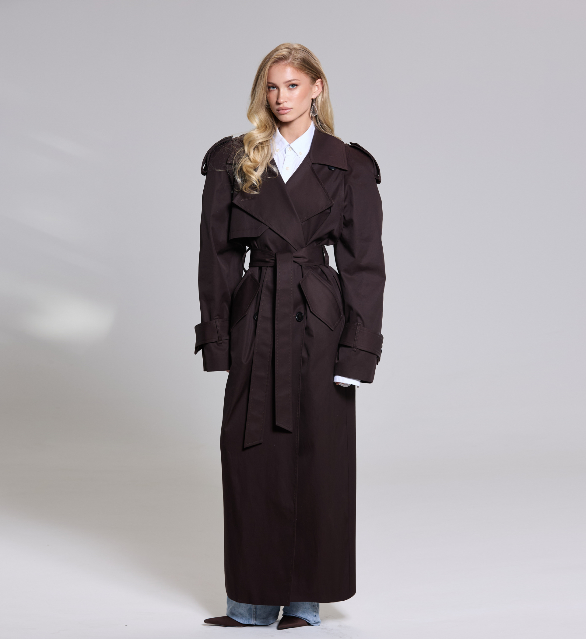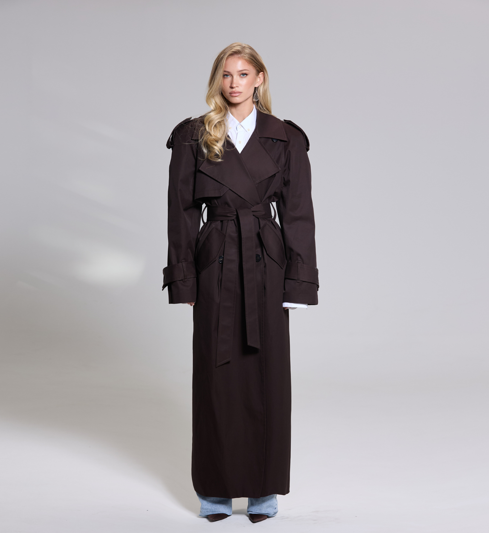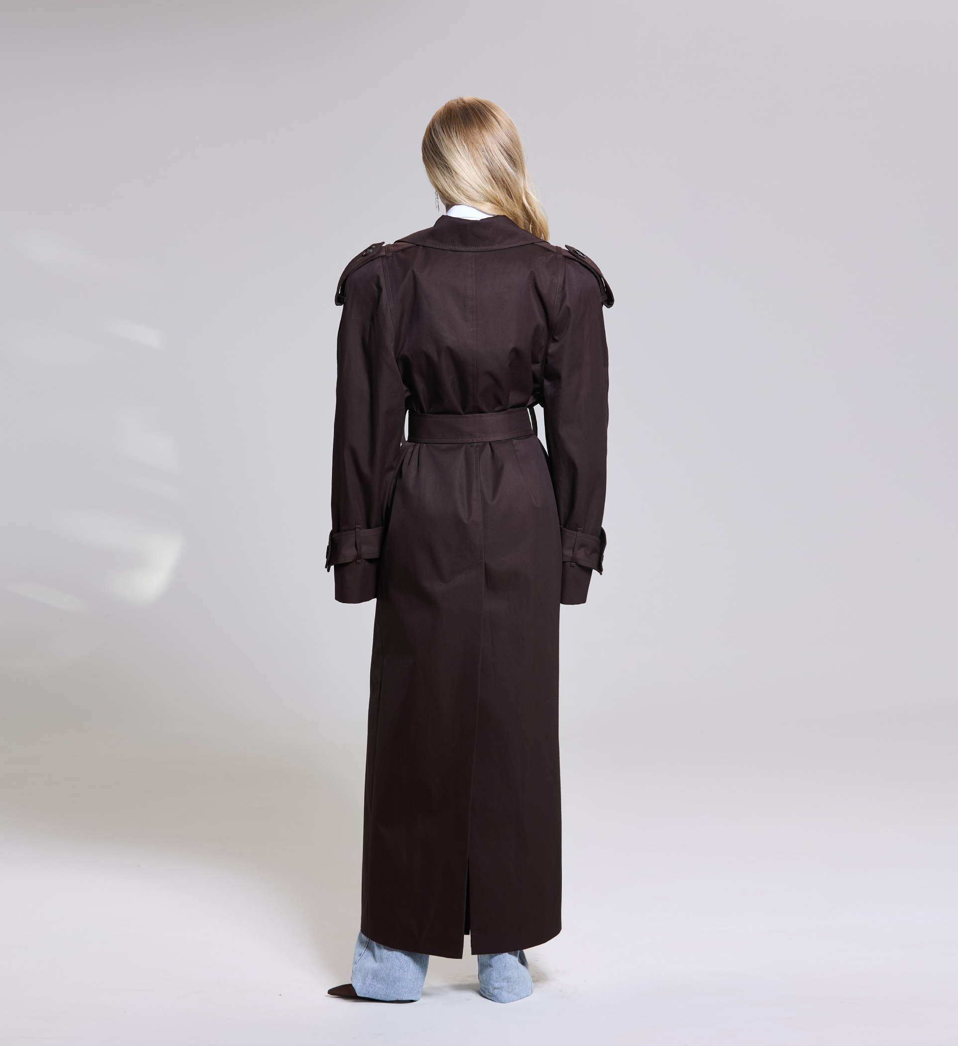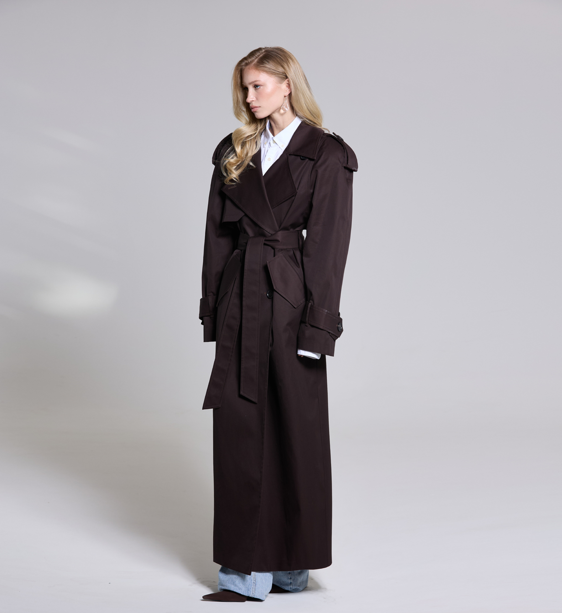 Тренч T-силуэта из 100% лоснящегося хлопка с водоотталкивающей пропиткой в длине maxi с пуговицами из рога.